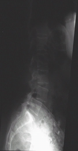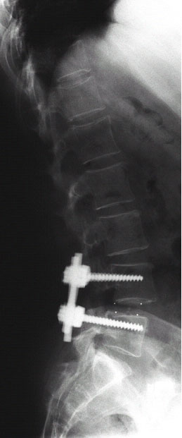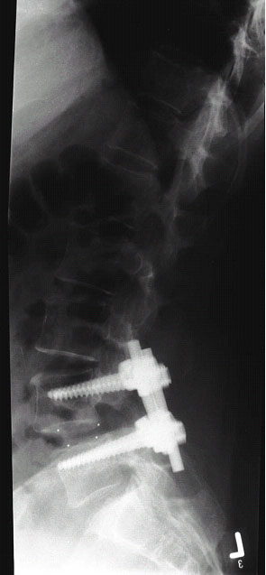 Seitliche Röntgenaufnahmen der selben Patientin nach der Operation (links) und nach einem Jahr (rechts). In jeden Wirbelkörper sind zwei Titanschrauben eingebracht (Bild mitte), verbunden sind die Schrauben mit jeweils zwei Titanstangen. Als Ersatz für die entfernte Bandscheibe dienen zwei Kunststoffwürfel (aus Carbon, erkennbar an punktförmigen Röntgenmarkierungen), welche mit dem Knochen des Patienten gefüllt sind. Auf dem rechten Bild ist die knöcherne Verbindung beider Wirbelkörper erkennbar.