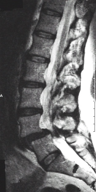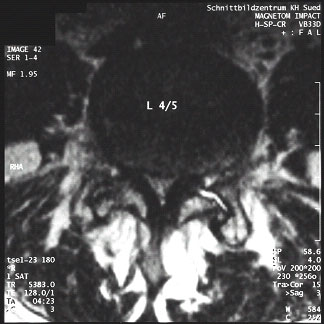 59jährige Patientin mit einem Wirbelgleiten zwischen dem 4. und 5. Lendenwirbelkörper und einer daraus resultierenden Einengung des Wirbelkanals (Pseudospondylolisthese bei Spinalkanalstenose. Normales seitliches Röntgenbild (links), Kernspintomographien (mitte und rechts).