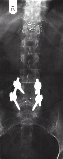 Seitliche Röntgenaufnahmen der selben Patientin nach der Operation (links) und nach einem Jahr (rechts). In jeden Wirbelkörper sind zwei Titanschrauben eingebracht (Bild mitte), verbunden sind die Schrauben mit jeweils zwei Titanstangen. Als Ersatz für die entfernte Bandscheibe dienen zwei Kunststoffwürfel (aus Carbon, erkennbar an punktförmigen Röntgenmarkierungen), welche mit dem Knochen des Patienten gefüllt sind. Auf dem rechten Bild ist die knöcherne Verbindung beider Wirbelkörper erkennbar.